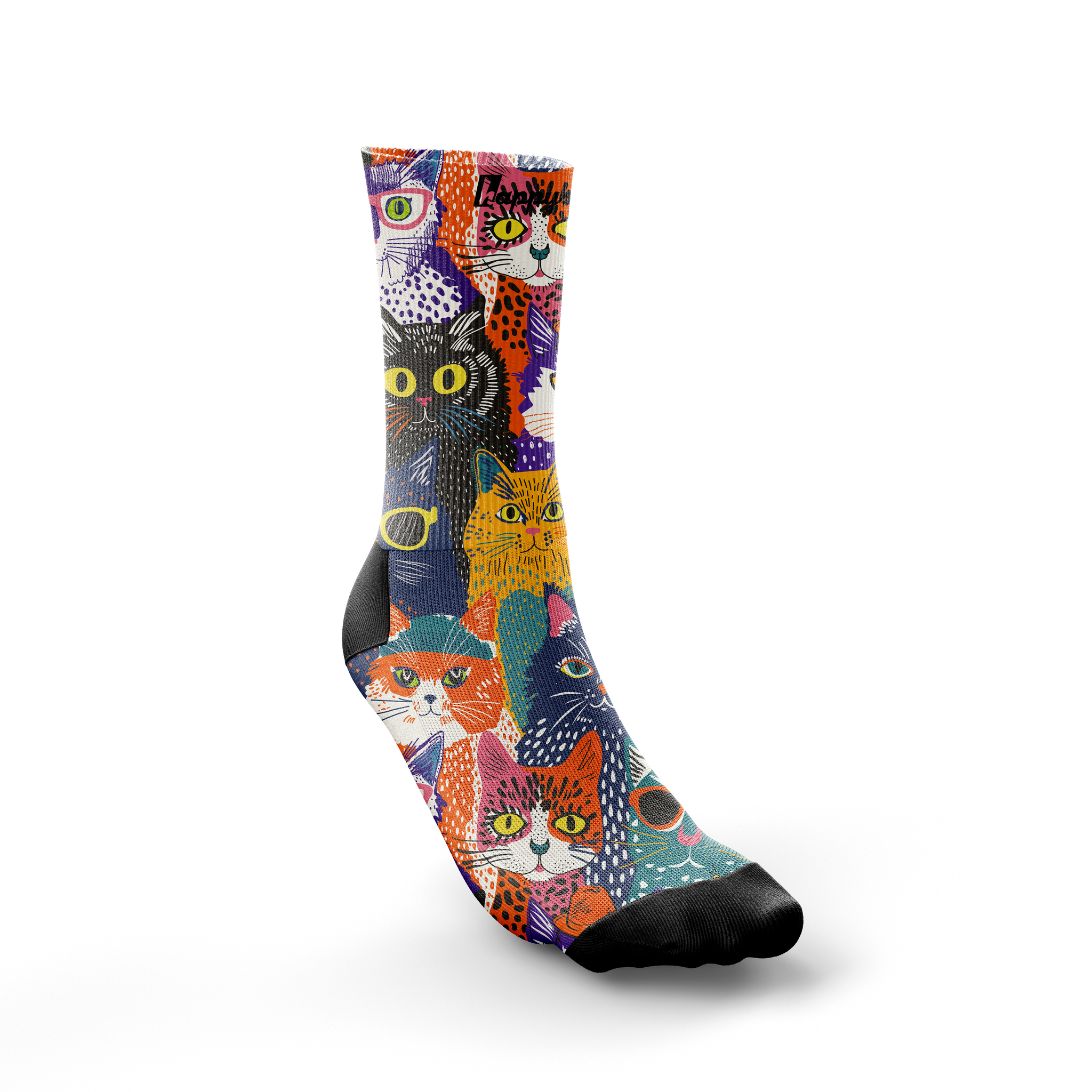 Calling all cat lovers! We totally love this super colourful pair of running & fitness crew socks featuring a wonderful family of feline friends, some in sunnies and specs, of course.