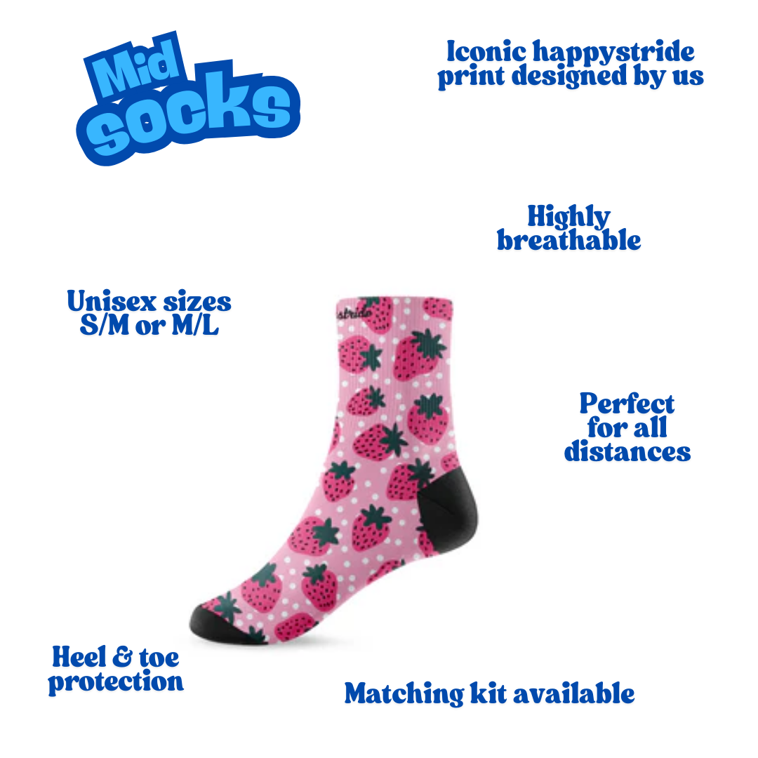 Pump up the jam.. PUMP IT UP! These super sweet strawberry unisex running and fitness mid socks are one of our favourite designs ever! Hand drawn by our designer, we think they are just perfect. With a lovely baby pink background with white dots and covered in juicy strawberries, these socks are perfect for any strawberry lovers out there.