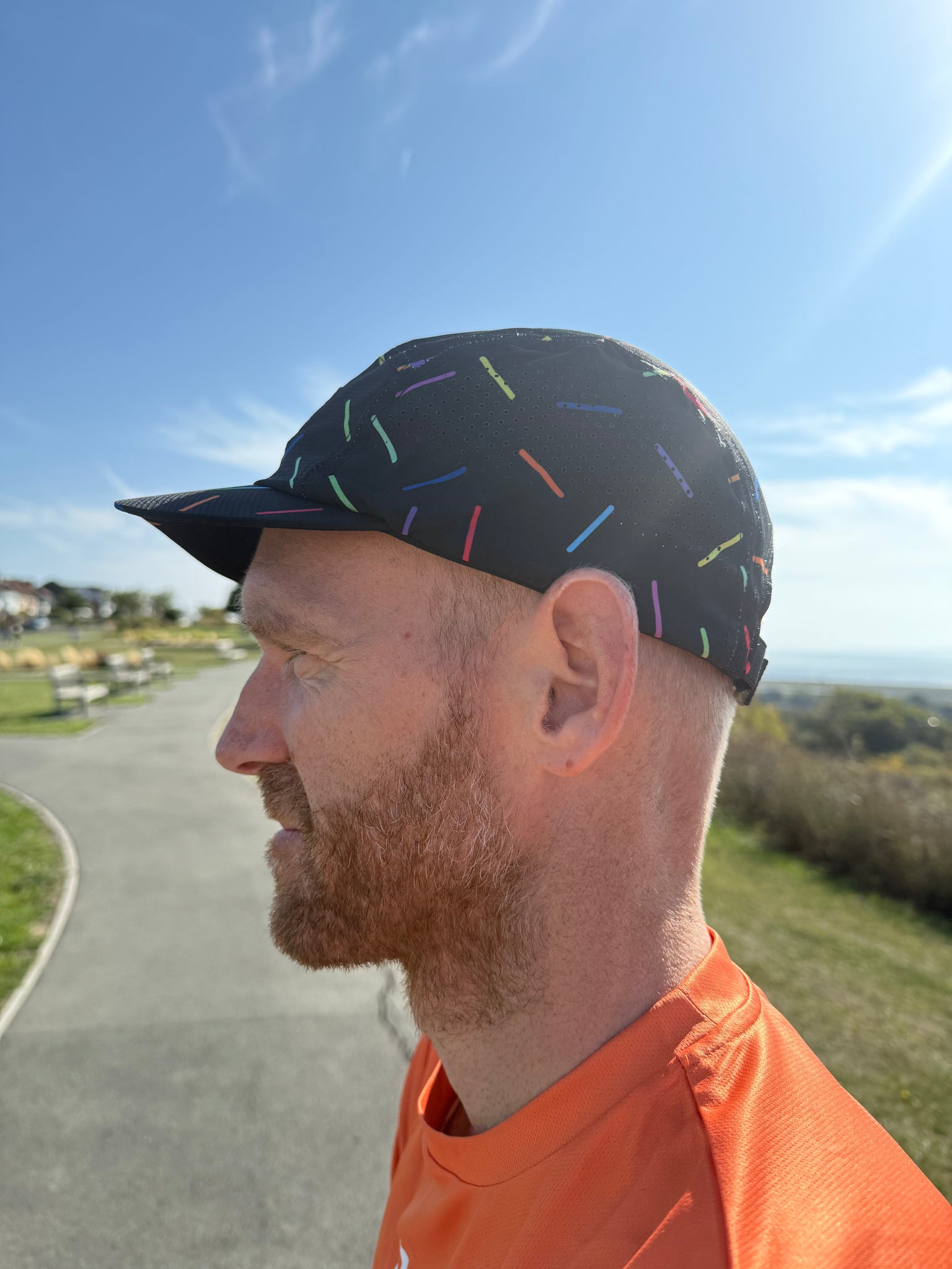 Check out this cool black sprinkle patterned unisex running & fitness cap with blue, green, yellow, orange, purple, pink and red sprinkles.
