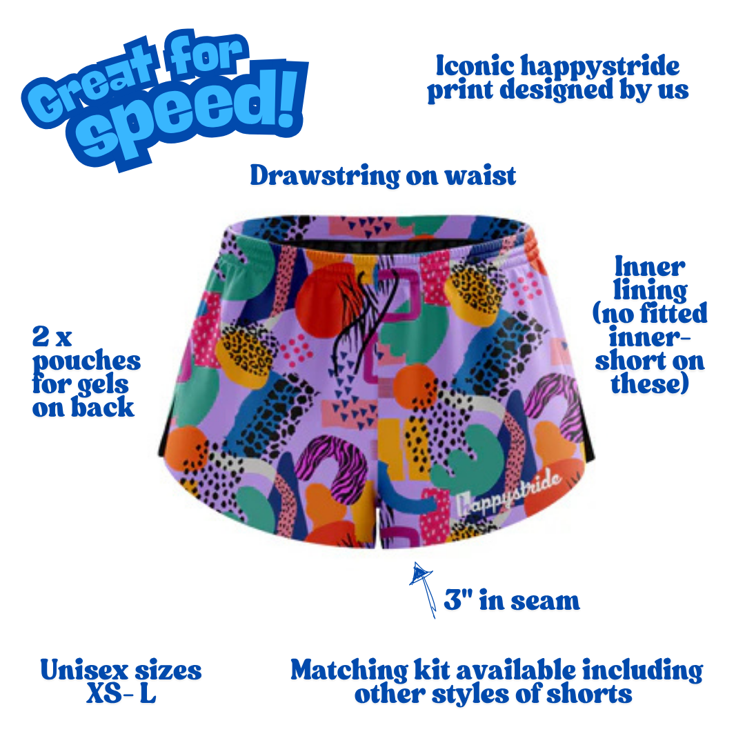 If you like to party (but you like running more), then this really cool pair of lilac based unisex running and fitness racer shorts are for you! They feature loads of cool shapes in red, green, purple, orange, yellow etc and have a retro but modern feel. These racer shorts will be sure to make you feel the part whether you're training or racing... or whatever you're up to!
