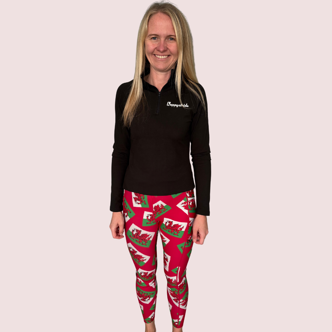 The people of Wales have spoken! We had many requests from our fan base in Wales for some Welsh flag leggings so here they are with a lovely red background. Perfect when running a race representing your country or for your Saturday morning parkrun! 🏴 In the photo Sam is 5ft 8, is a UK size 12 and wears medium.