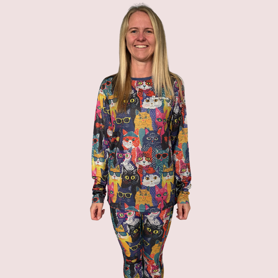 Calling all cat lovers! We totally love this super colourful long sleeve featuring a wonderful family of feline friends, some in sunnies and specs, of course. In the photos, Pete is 6ft 1 and wears medium. Sam is 5ft 8, is a UK size 10-12 and wears small.