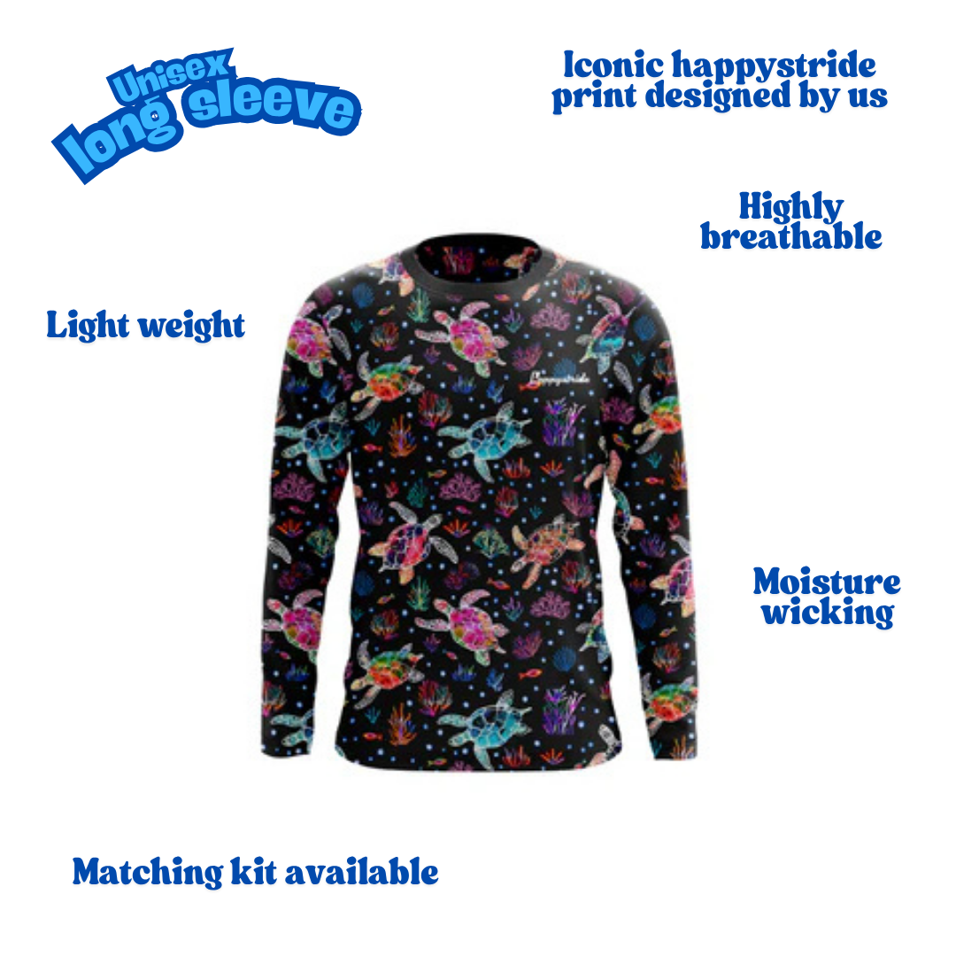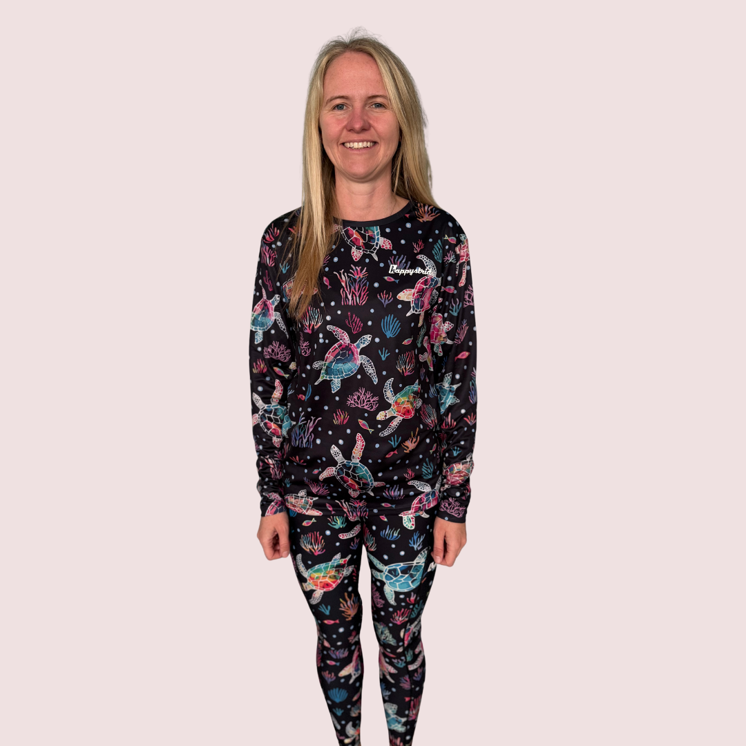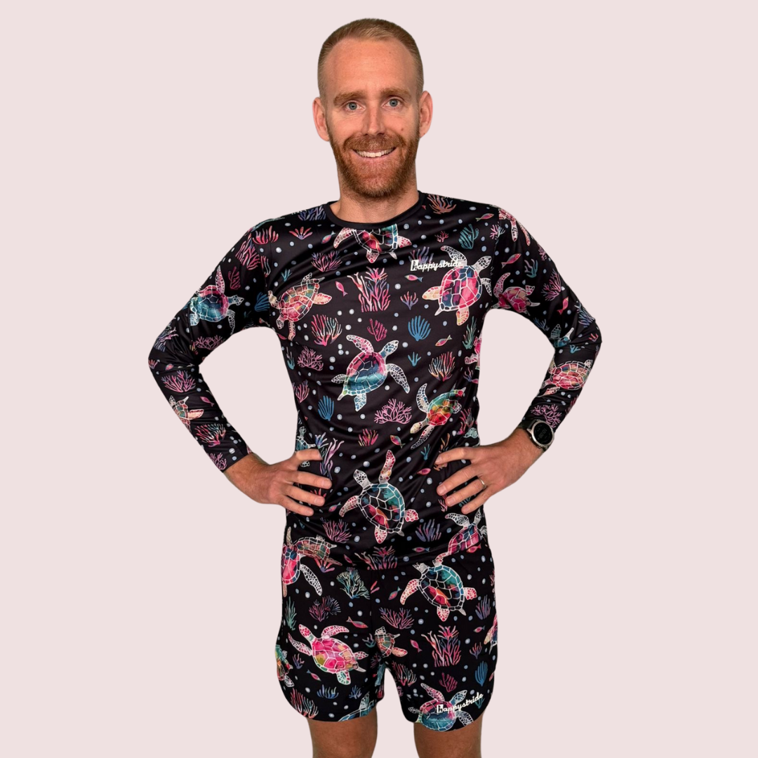 Under the sea! A perfect long sleeve for those ocean lovers. The background is black with multicoloured turtles and coral reefs. One of our more calming designs! In the photos, Pete is 6ft 1 and wears medium. Sam is 5ft 8, is a UK size 10-12 and wears small.