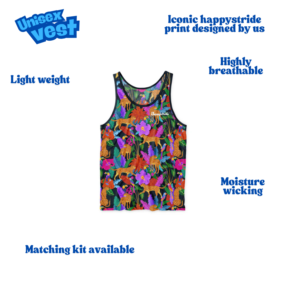 A gorgeous array of bright jungle vibes featuring various animals on a black background. This unisex running and fitness vest will be sure to make you stand out in the crowd!