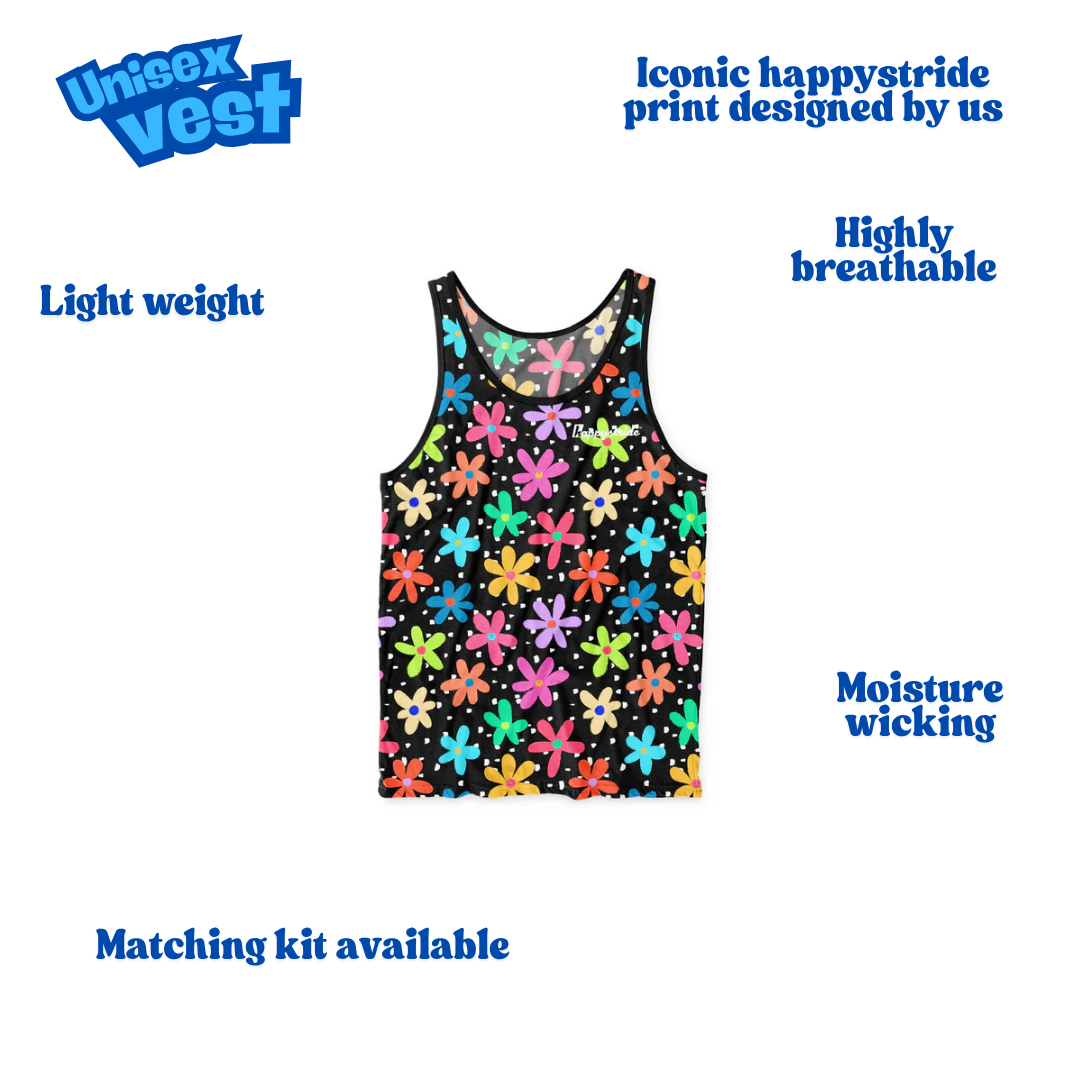 Check our this pretty petal unisex running and fitness vest. Featuring loads of great simple hand drawn flowers in pink, orange, yellow, blue and purple on a black background with small white dots. This vest is super classy and fun at the same time and you'll be sure to stand out.