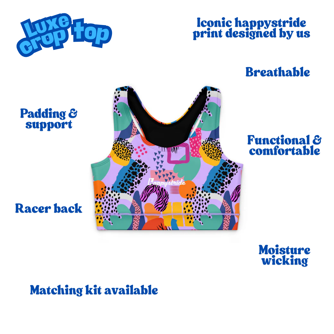 If you like to party (but you like running more), then this really cool lilac based running and fitness luxe crop top for you! It features loads of cool shapes in red, green, purple, orange, yellow etc and have a retro but modern feel. This crop top will be sure to make you feel the part whether you're training or racing... or whatever you're up to! Our crop tops are an essential piece which we believe everyone should own, featuring great padding and support and ideal for any run or workout!