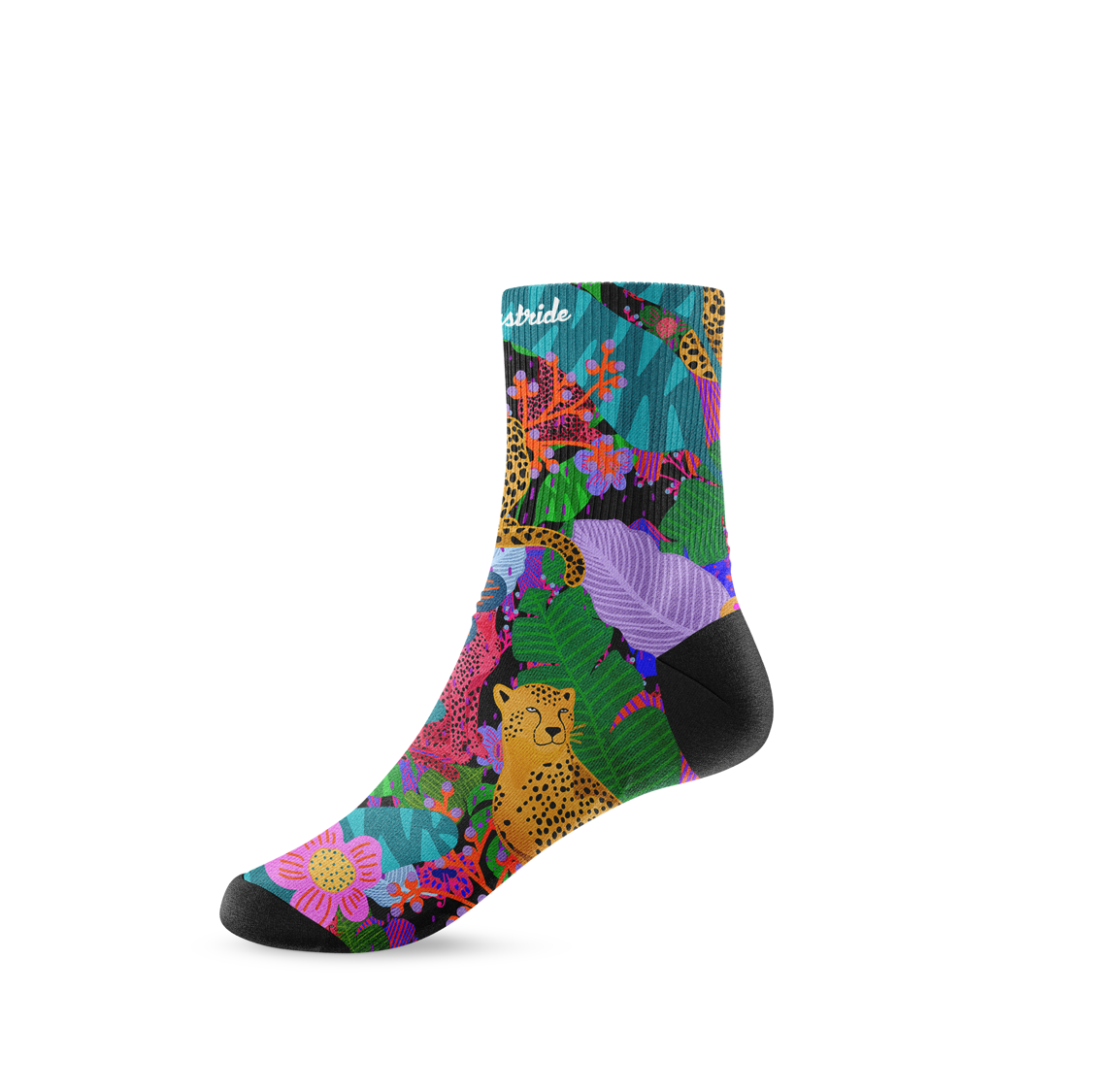 Cheetahs always win - We don't conform with cheating but we do support cheetahs on socks.. obvz! Get the look with these hot pinks, purples, greens and... pretty much every colour floral / jungle shorts featuring a few cheeky cheetahs. We really, really love these unisex running & fitness mid socks.