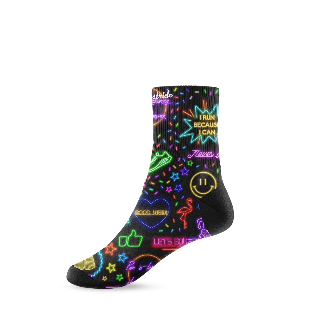 Let's glow with these super cool and standout black based unisex running and fitness mid socks - featuring loads of cool neon phrases and shapes in pink, purple, green etc. Phrases include the likes of "good vibes", "running makes me happy", "I run because I can", "let's go" and "I've got this!". If you fancy something subtle but still funky which will turn heads, then these socks tick those boxes!