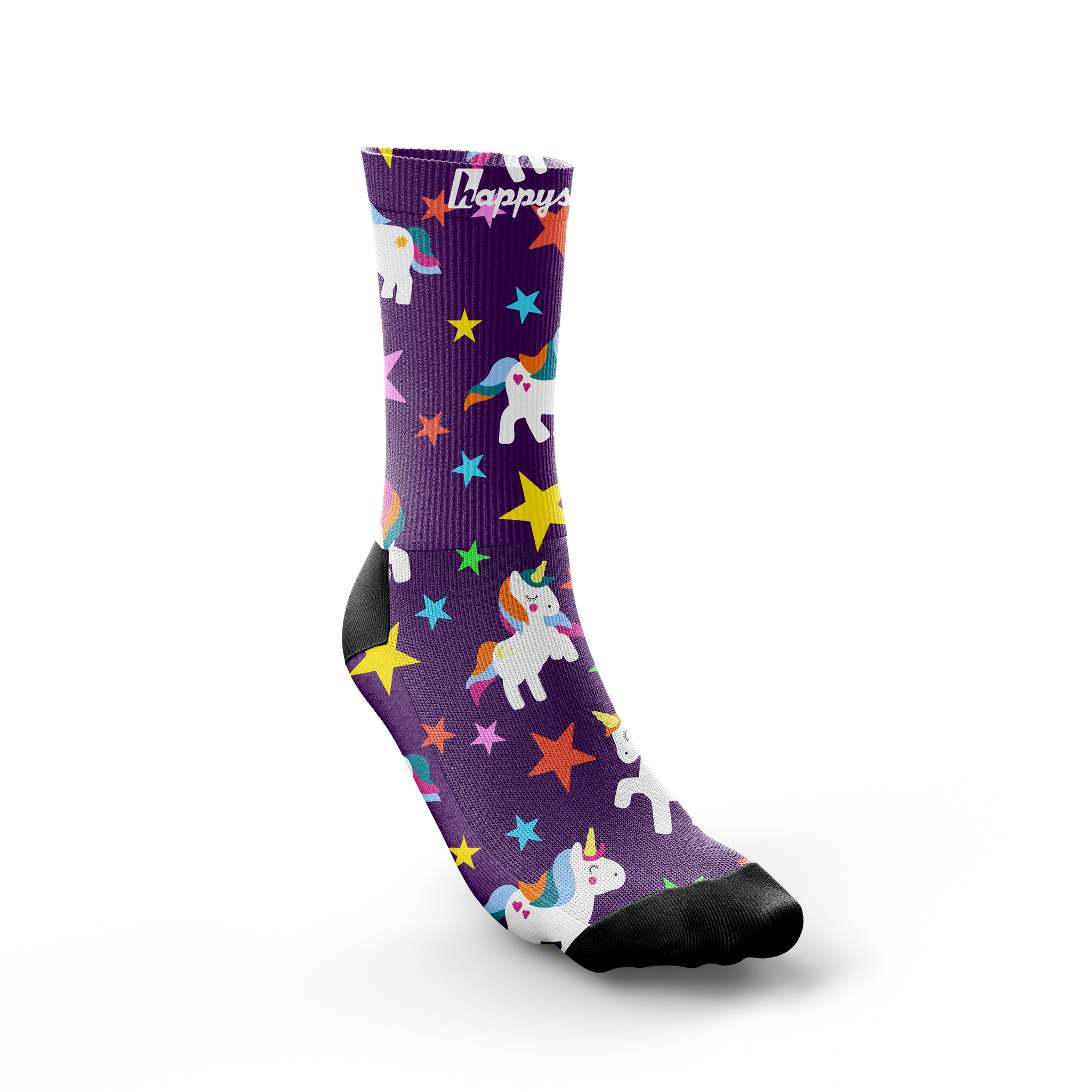 Step into the magical land of unicorns and stars with this cute purple pair of unisex running and fitness crew socks which feature adorable unicorns and brightly coloured multicoloured stars. These are a total showstopper and will attract some attention whilst out running or at races... and may even bring some magical unicorn dust to your running and fitness! Matching shorts, t-shirt and vest available.