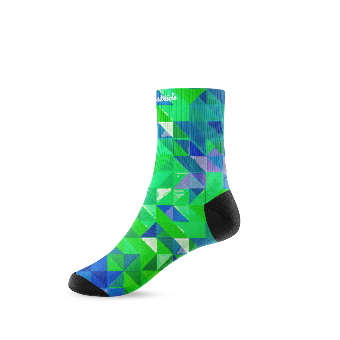 Check out these cool patterned unisex running & fitness mid socks in a blue and green mismatch of geometric shapes.