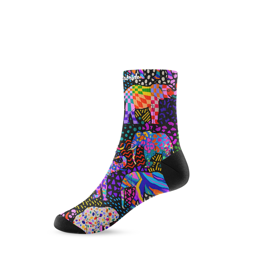 Love elephants? These are for you! Our "pack your trunks" elephant unisex running and fitness mid socks feature a plethora of cool and funky elephants in pinks, purples and loads of bright colours, on a black background. Think that famous brightly coloured elephant but even.. better!!