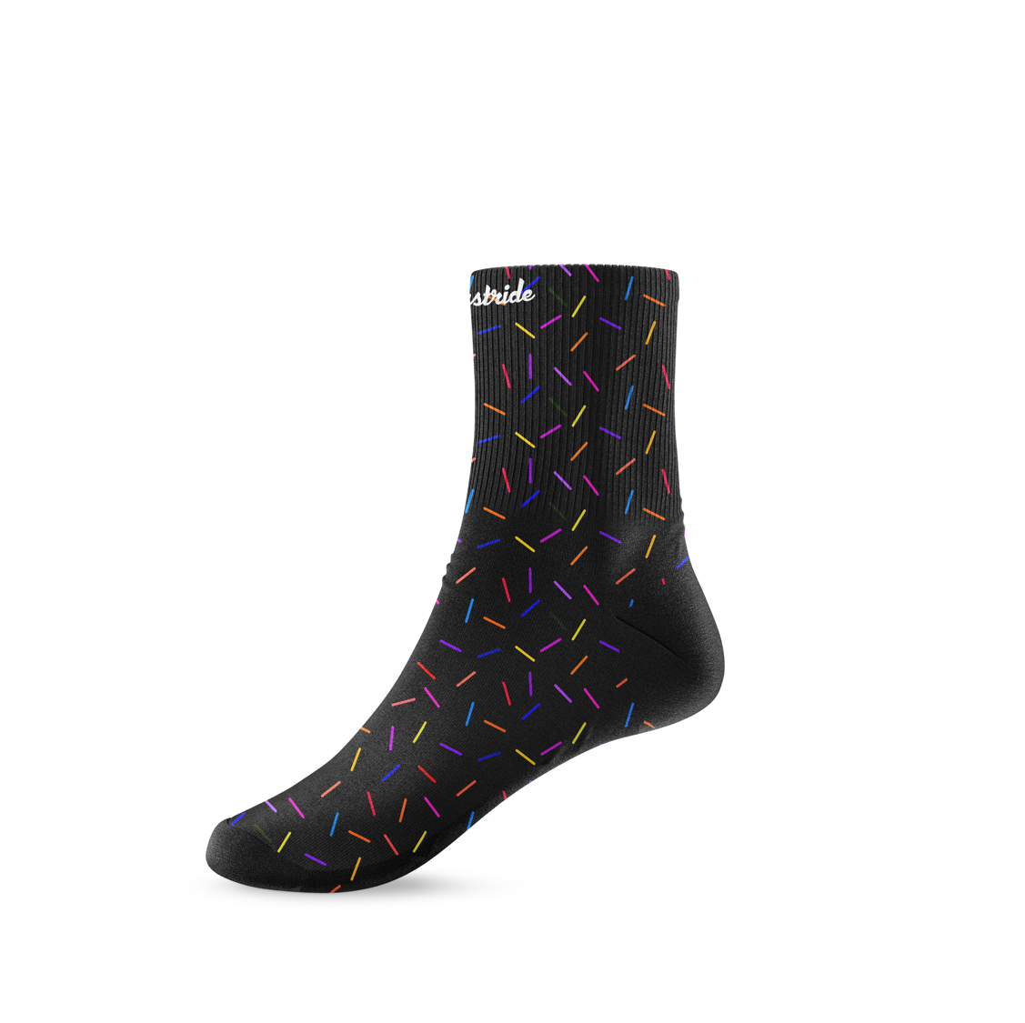 Stand out on the start line with these cool black unisex running & fitness mid socks in our ‘’Sprinkle of joy’’ print with blue, green, yellow, orange, purple, pink and red sprinkles.