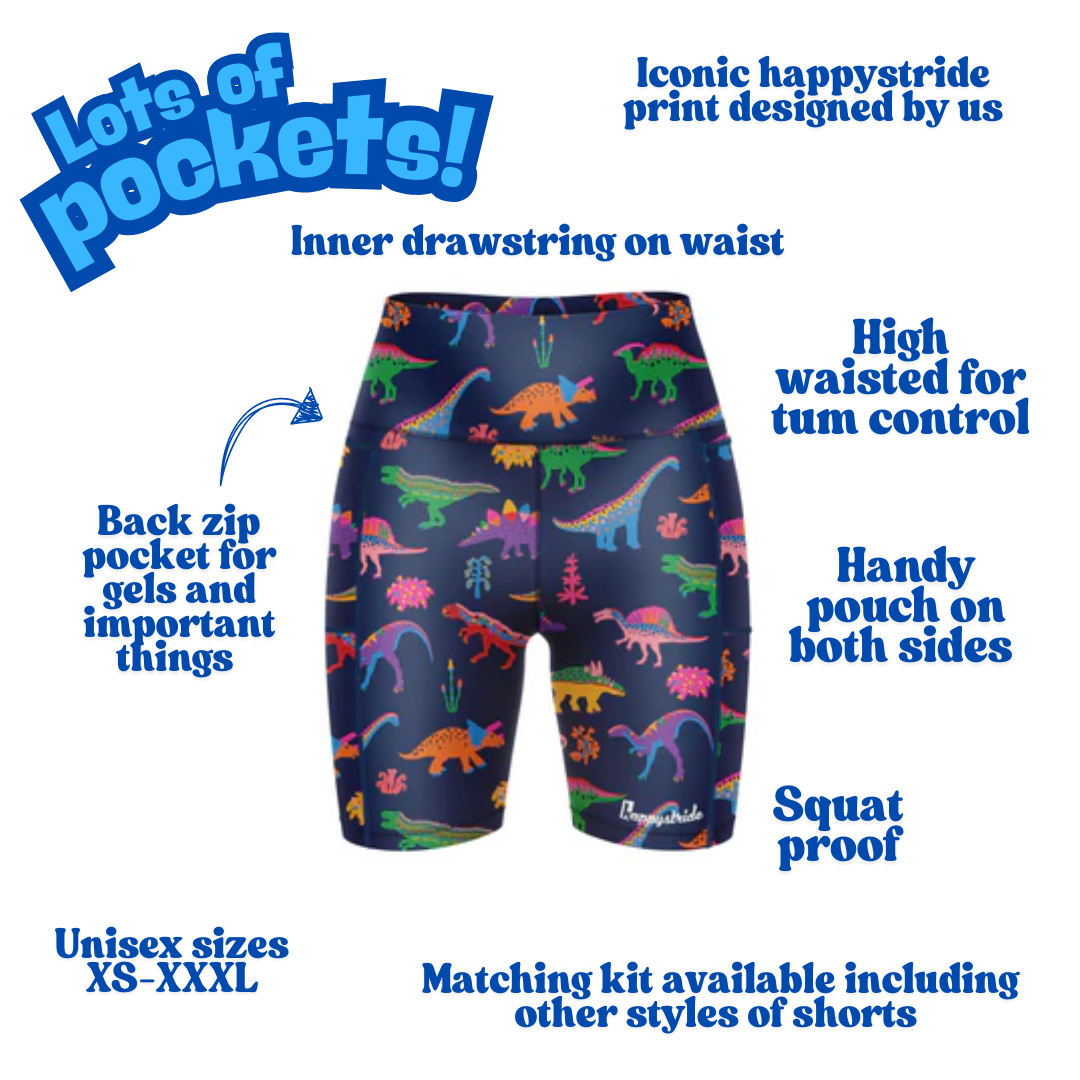 Calling all dinosaur lovers! These navy dino shorts featuring brightly multicoloured dinosaurs in purple, pink, green and orange will have your soaring along the pavements. As well as being a great conversation starter with other dinosaur fans!
