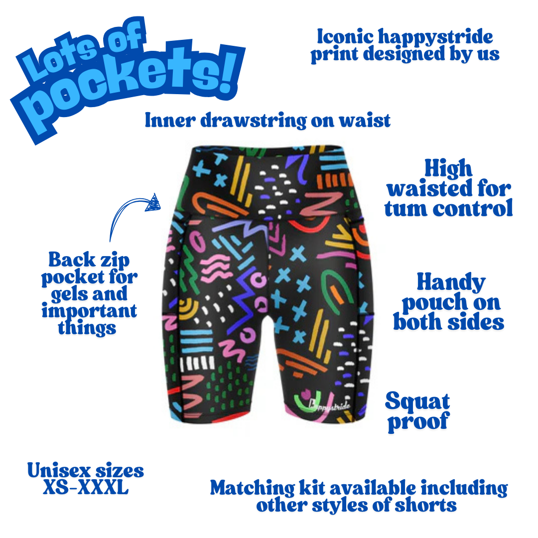 Stand out with this pair of funky doodle-like unisex running and fitness shorts. On a black background with pink, green, blue etc coloured doodle shapes and patterns. A real crowd pleaser! This design is also available in our classic shorts, so you can go matchy-matchy with a friend.