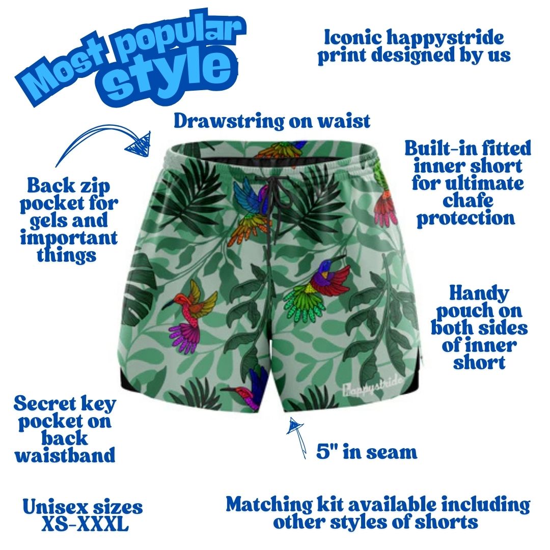 Flap your wings - did your know that hummingbirds make their sound by flapping their wings? Well, flap your wings and you'll be off off off and away on a 5k with these lovely minty green running & fitness shorts with a few colourful hummingbirds. Nothing too major but a lovely little nod to a cute little bird.
