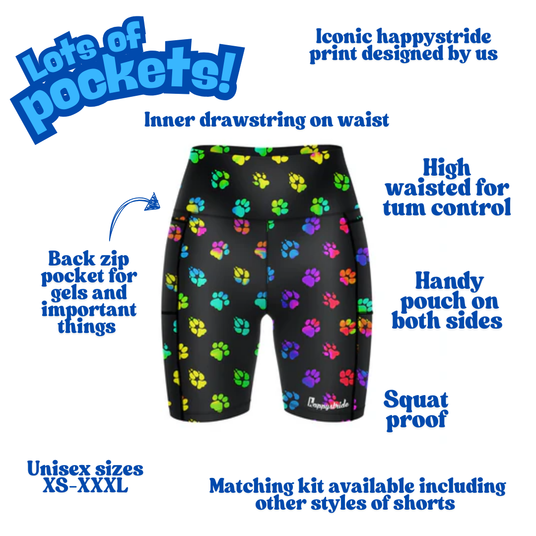 These black running & fitness fitted shorts with multicoloured paws are purrrfect for animal lovers out there. Matching socks available.