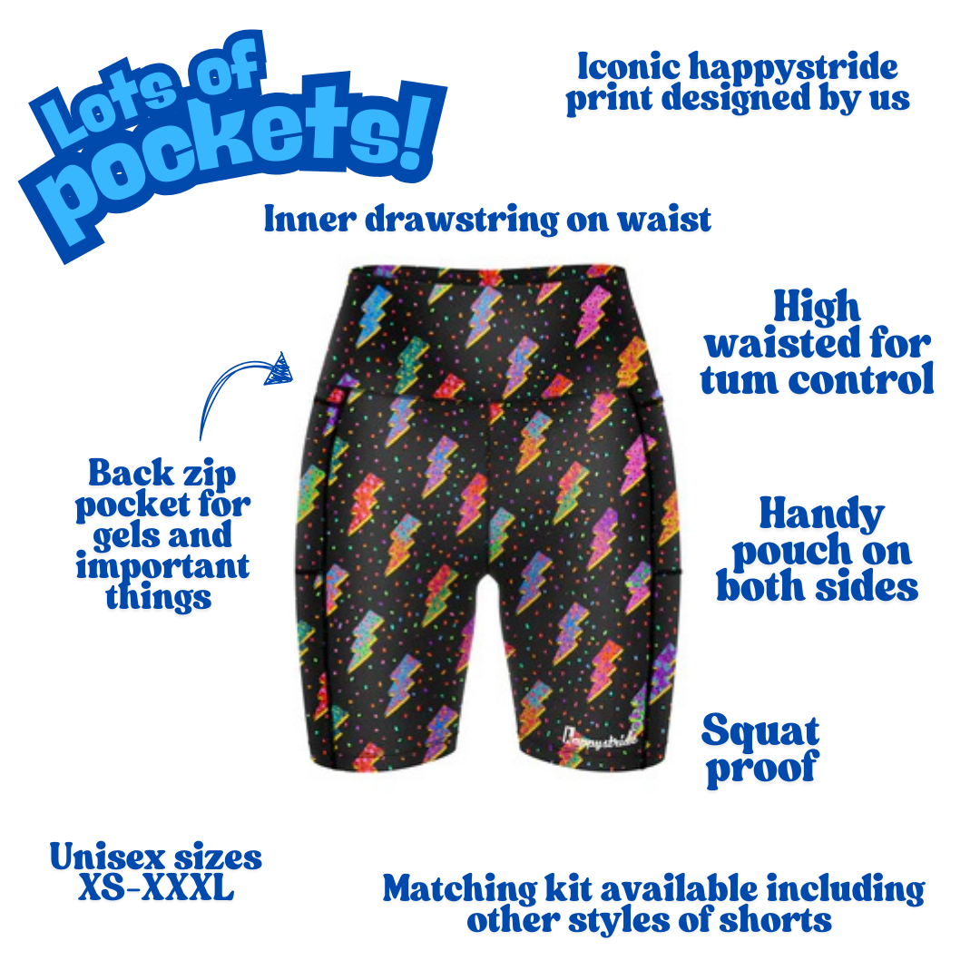A super striking pair of happystrides! You'll love these multicoloured lightening strikes on a speckled black background. Featuring lightening strikes in pink, red, purple, blue, green and red, you're sure to stand out - and run super fast - in these!