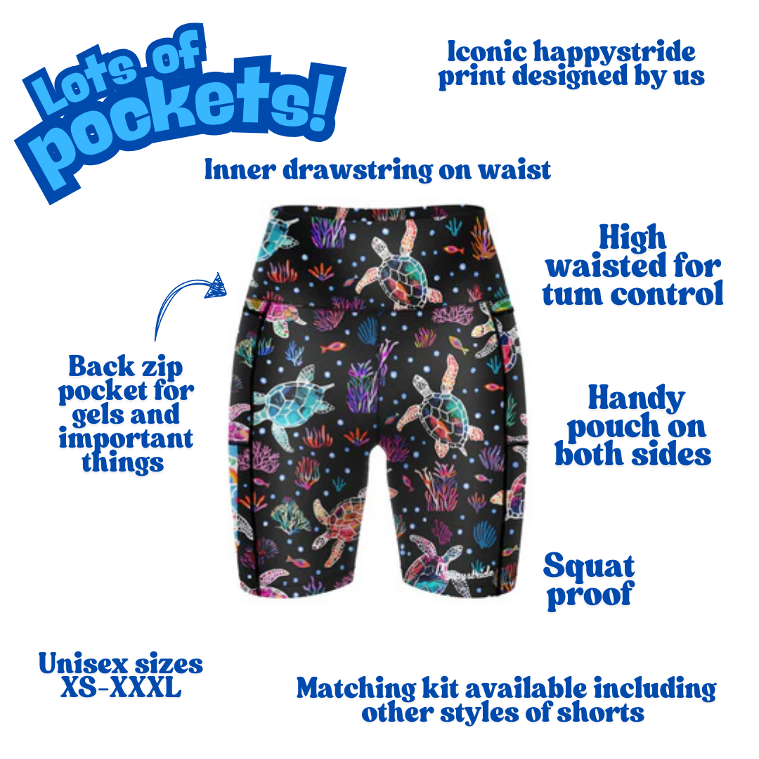 Under the sea! A perfect pair of shorts for those ocean lovers. The background is black with multicoloured turtles and coral reefs. One of our more calming designs!