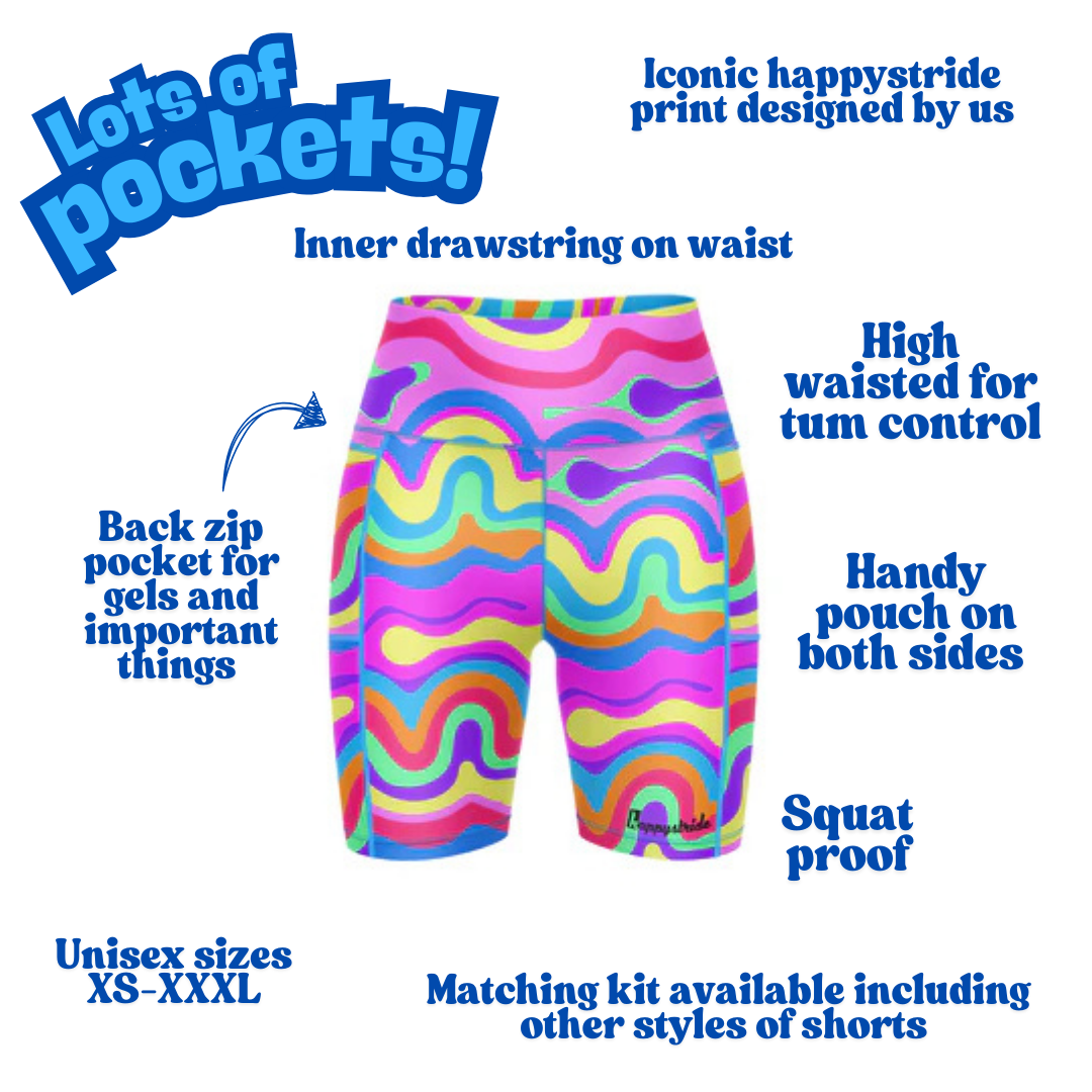 Introducing these brightly coloured unisex running & fitness shorts featuring bright swirly colours or pink, orange, blue, green, purple and yellow. If you want something really stand out - give them a go! This design is also available in our classic shorts, so you can go matchy-matchy with a friend.