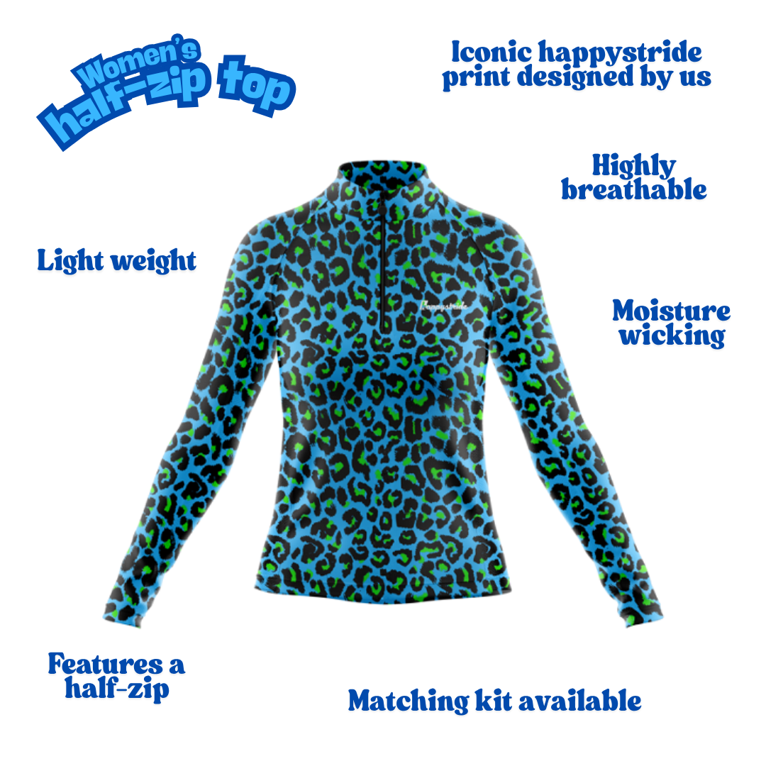 Get spotted with this leopard blue, green and black running & fitness women's half-zip top. Matching fitted shorts & leggings available.