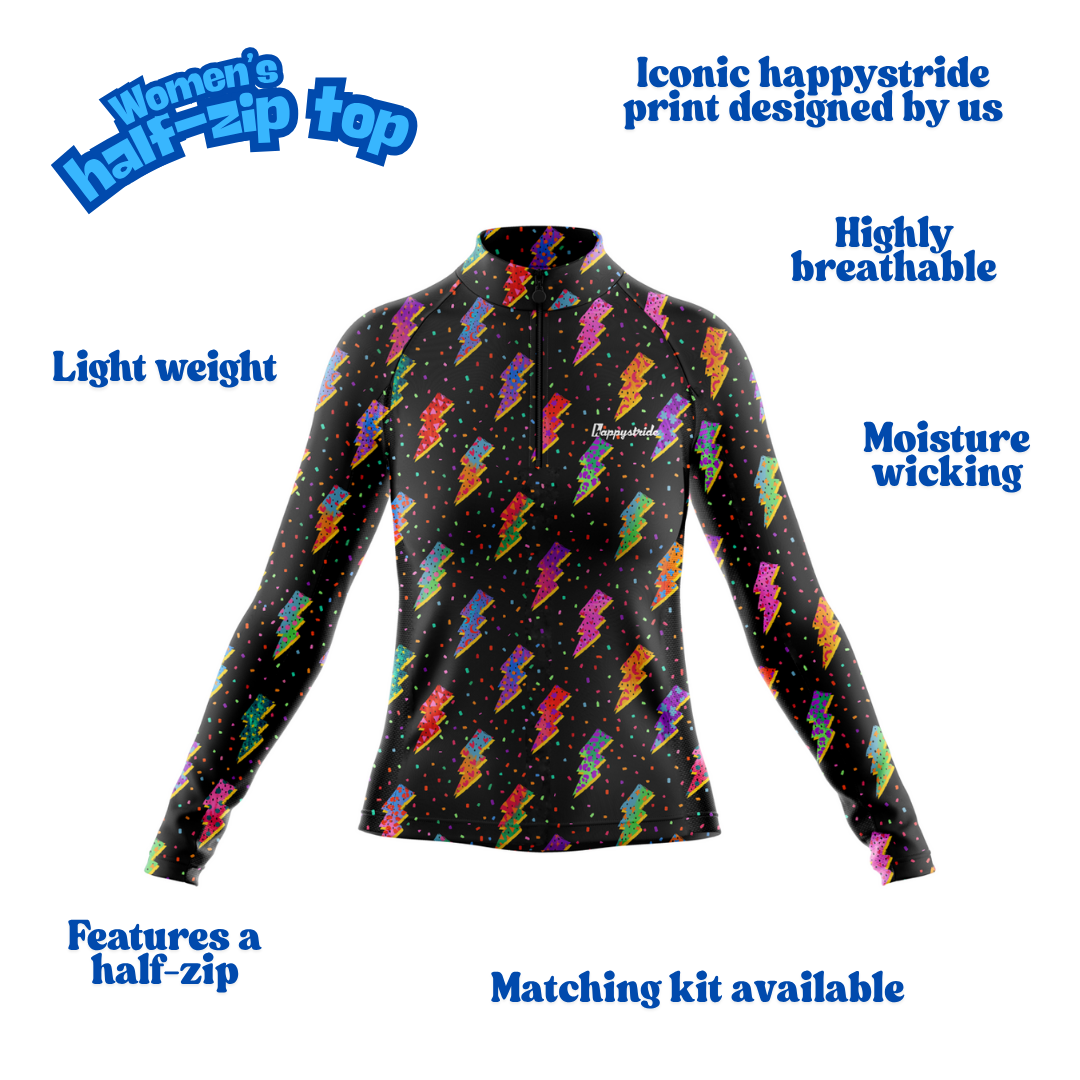 A super striking happystride women's half-zip top! You'll love this multicoloured lightening strikes on a speckled black background. Featuring lightening strikes in pink, red, purple, blue, green and red, you're sure to stand out - and run super fast - in this half-zip top!