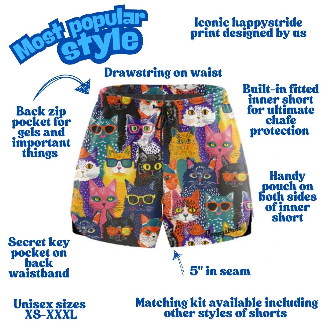 Calling all cat lovers! We totally love this super colourful pair of shorts featuring a wonderful family of feline friends, some in sunnies and specs, of course.